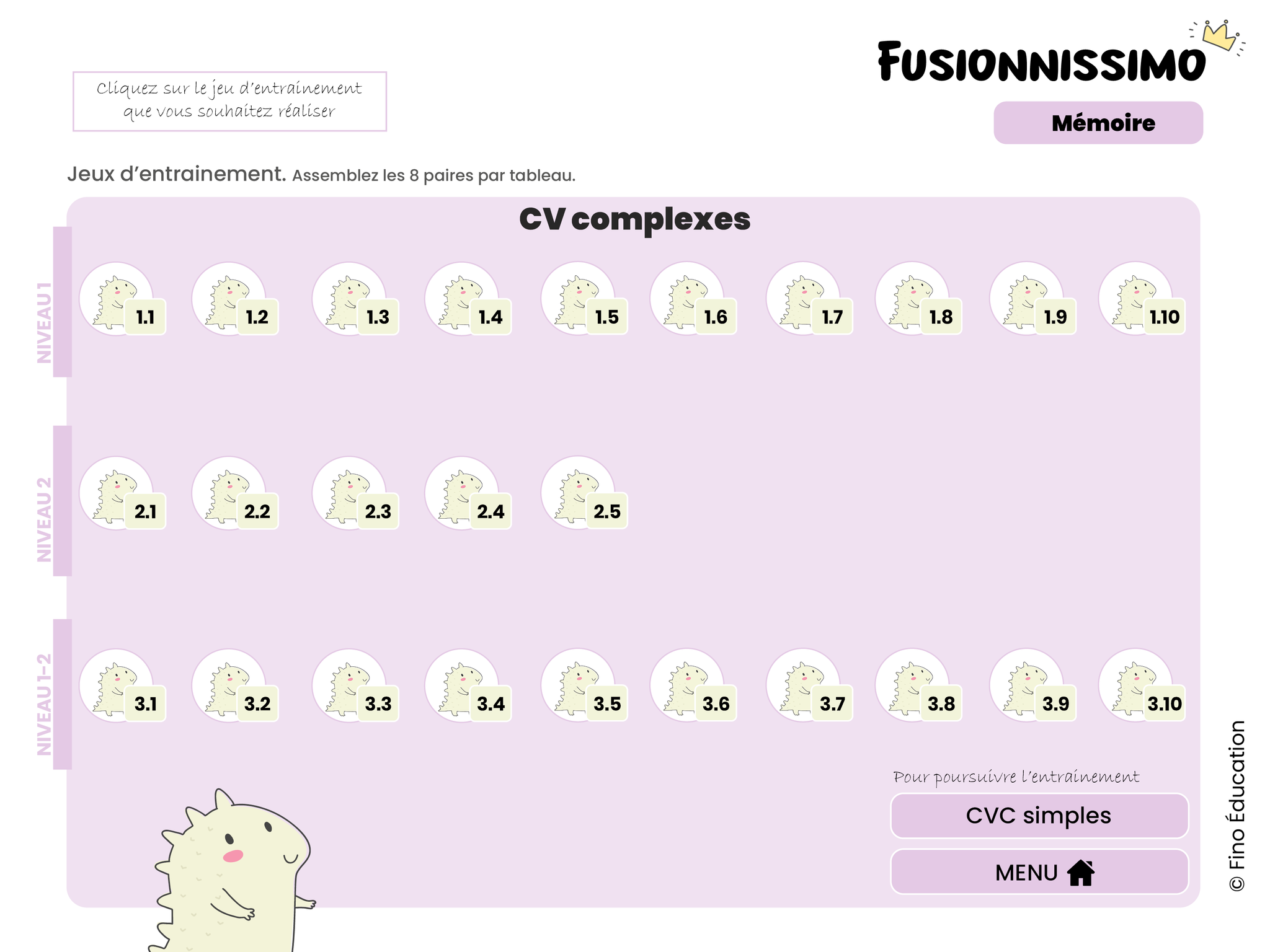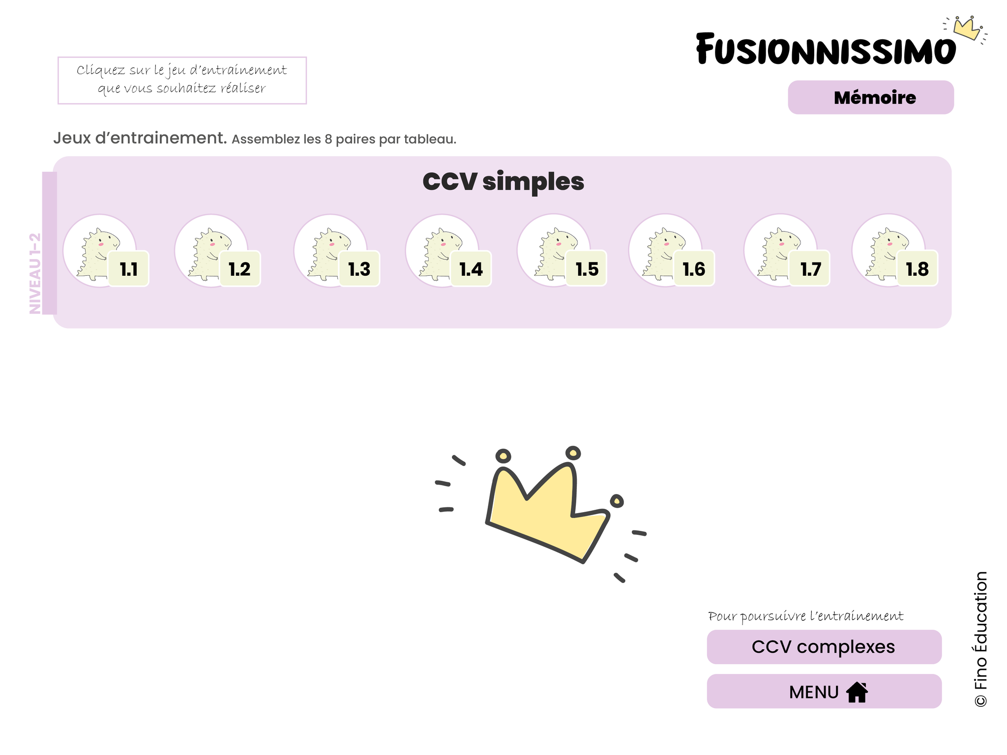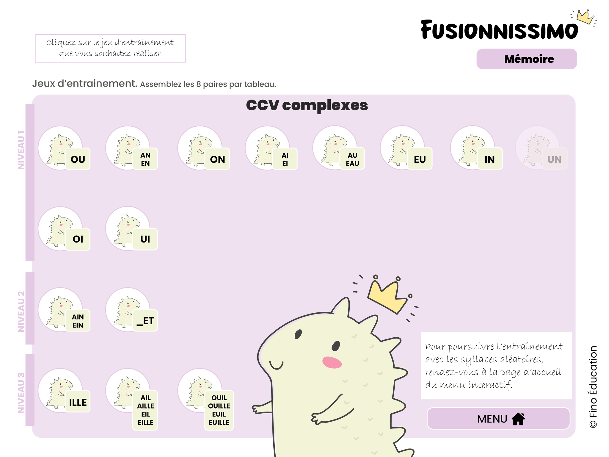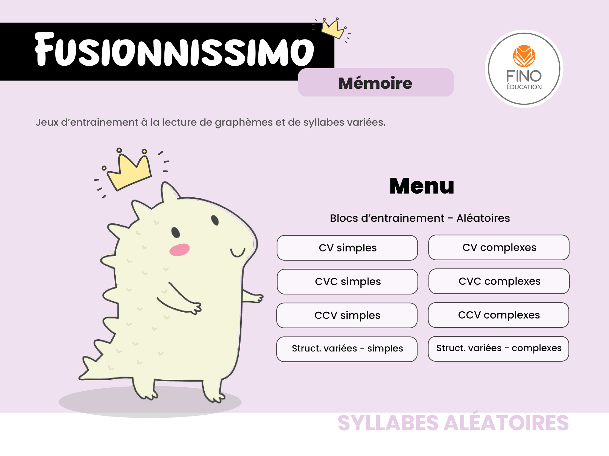 Ce matériel numérique interactif est composé de 255 jeux de mémoire permettant de consolider et d’automatiser la lecture de syllabes et de graphèmes, dans un contexte ludique et motivant. Il s’inscrit dans la continuité des trois autres outils de la collection Fusionnissimo, en favorisant la répétition et le renforcement des apprentissages dans un format de jeu.