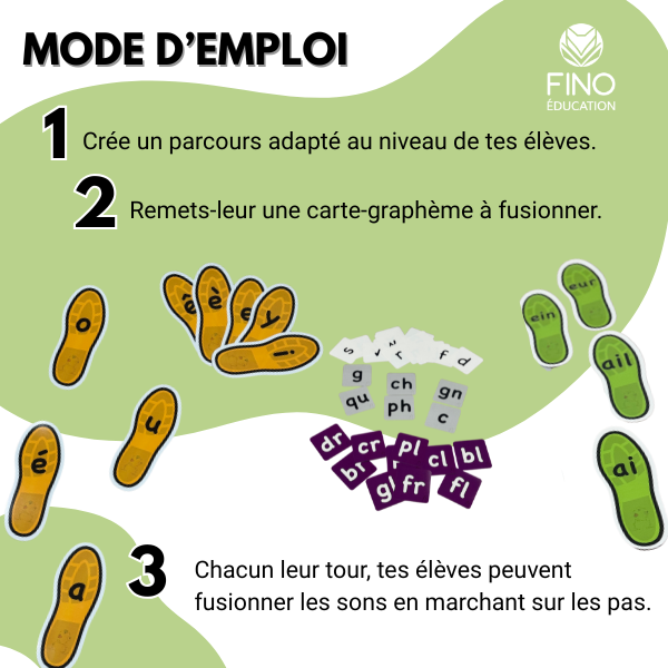 En marchant sur les traces de pas, l’apprenant associe les graphèmes à leurs phonèmes, renforçant la reconnaissance et la mémorisation. Les cartes imagées soutiennent la compréhension des graphèmes complexes et permettent d’adapter le niveau de difficulté selon les besoins des lecteurs débutants ou en difficulté. L’apprenant progresse ainsi dans sa lecture… un pas à la fois!