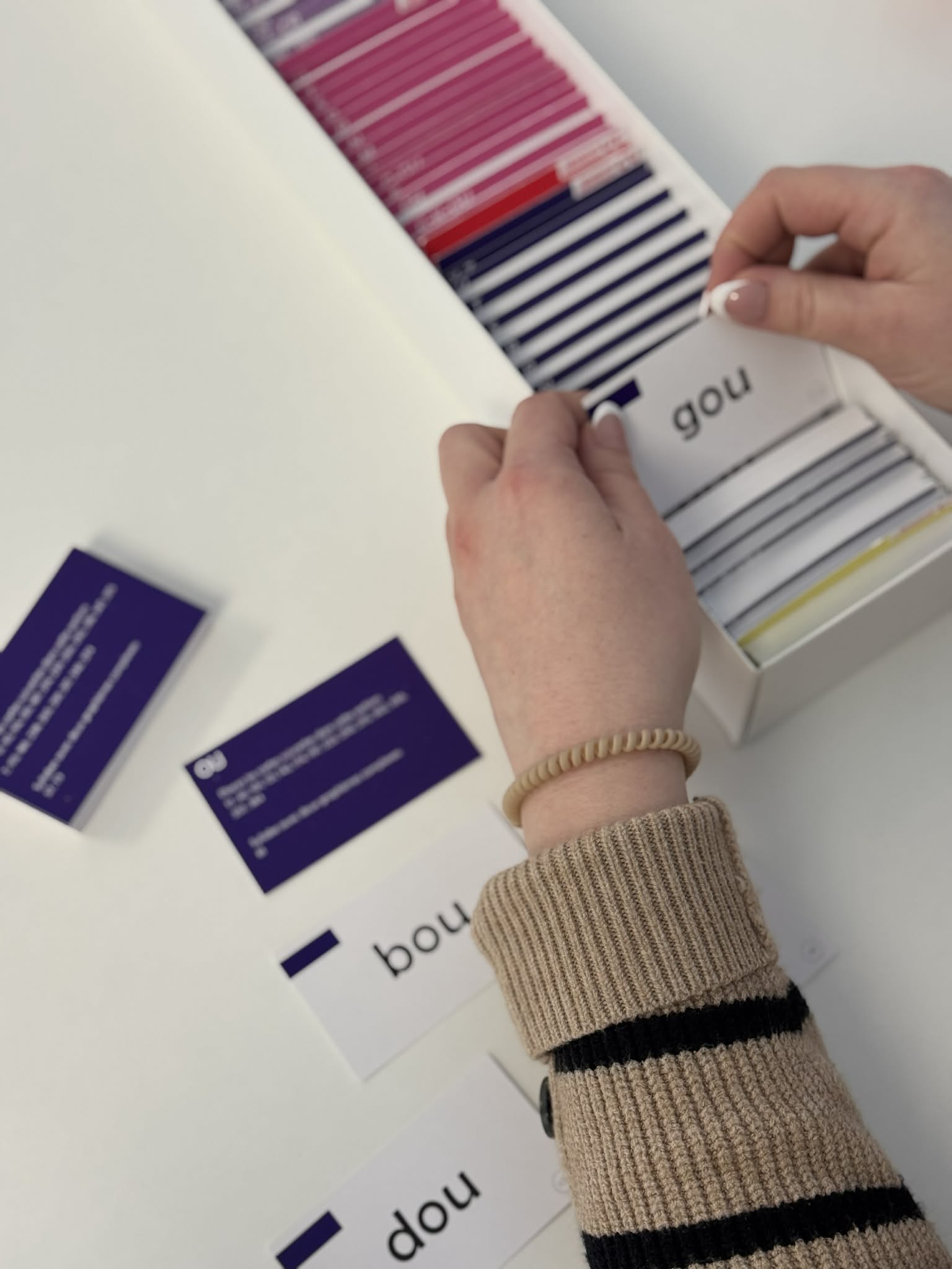 Le boîtier original comprend 1122 cartes-syllabes classées selon les structures syllabiques et les graphèmes initiaux. Toutefois, lors du travail ciblé d’un son amoureux ou d’un graphème complexe particulier (ex. : ou, an, eau, oi), le repérage des cartes correspondantes peut s’avérer moins intuitif.