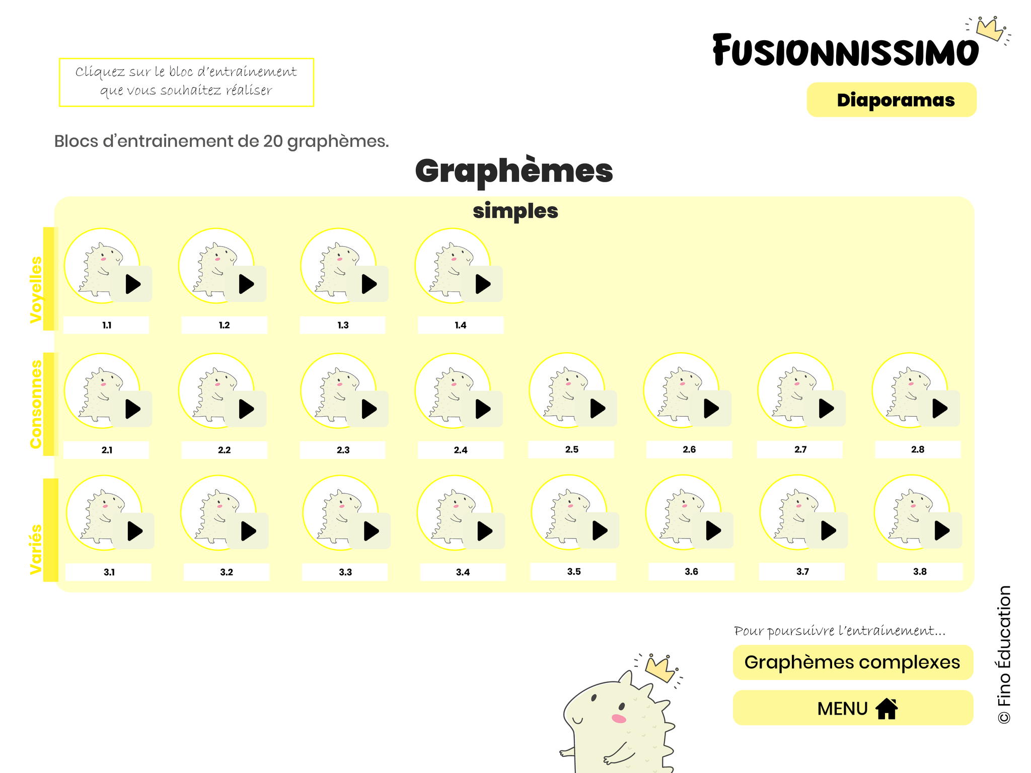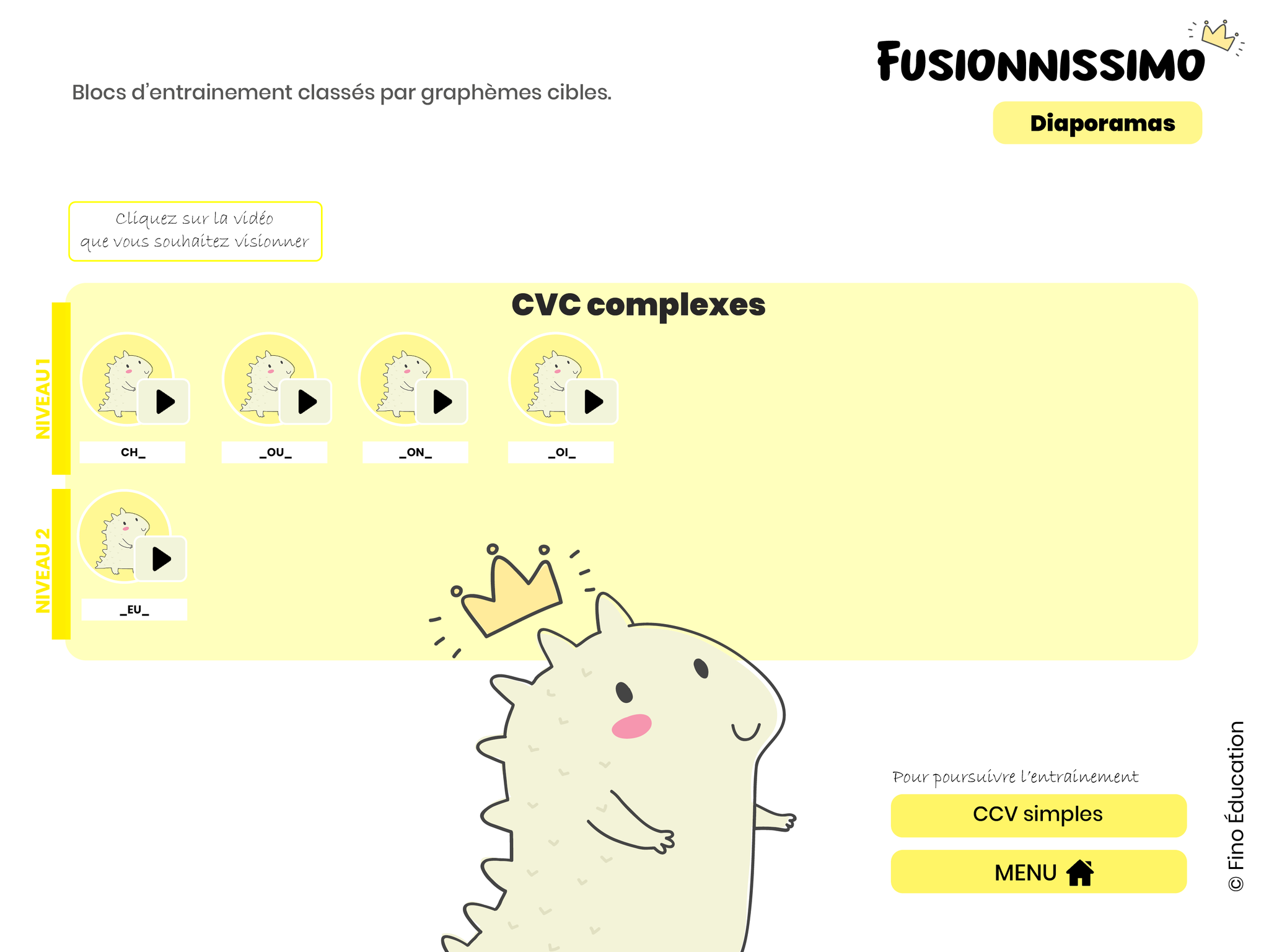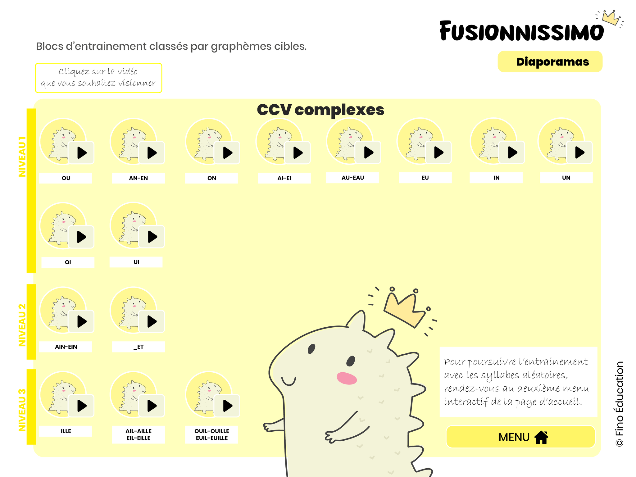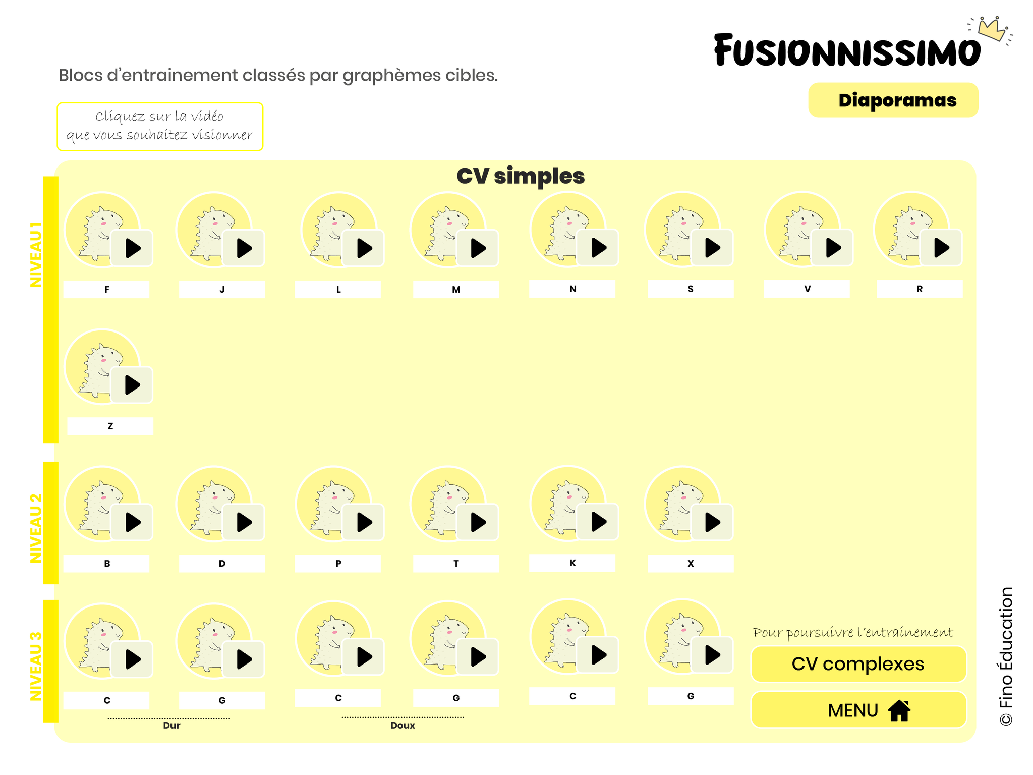 Ce matériel numérique interactif est composé de 306 vidéos favorisant l'automatisation de la lecture de syllabes en amenant les élèves à lire de plus en plus rapidement les différents graphèmes et les différentes structures syllabiques.